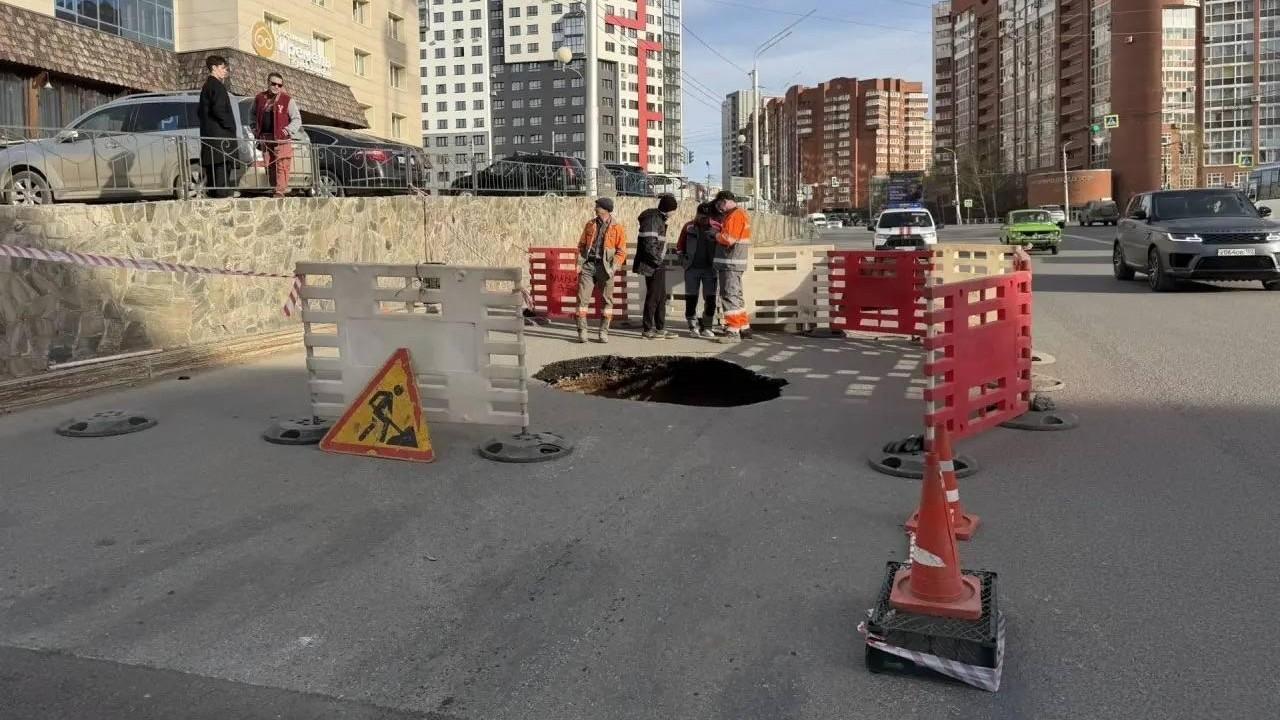 Огромная яма образовалась на дороге у ТЦ «Иремель» в Уфе